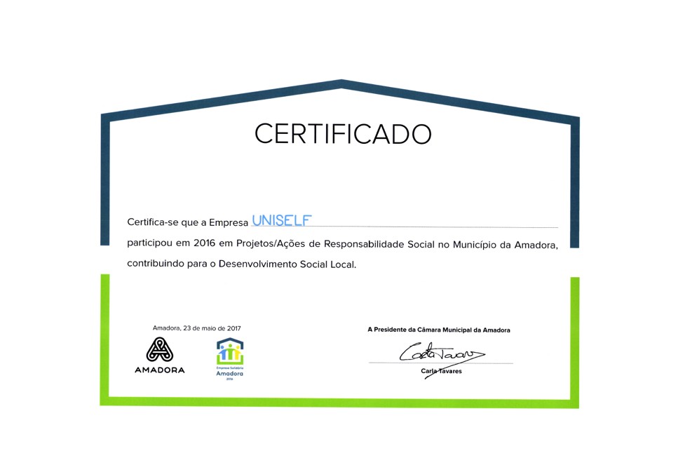 We proudly received from the City Hall of Amadora the certificate of participation in Social Responsibility Projects/Actions in the Municipality of Amadora, referring to the year 2016.